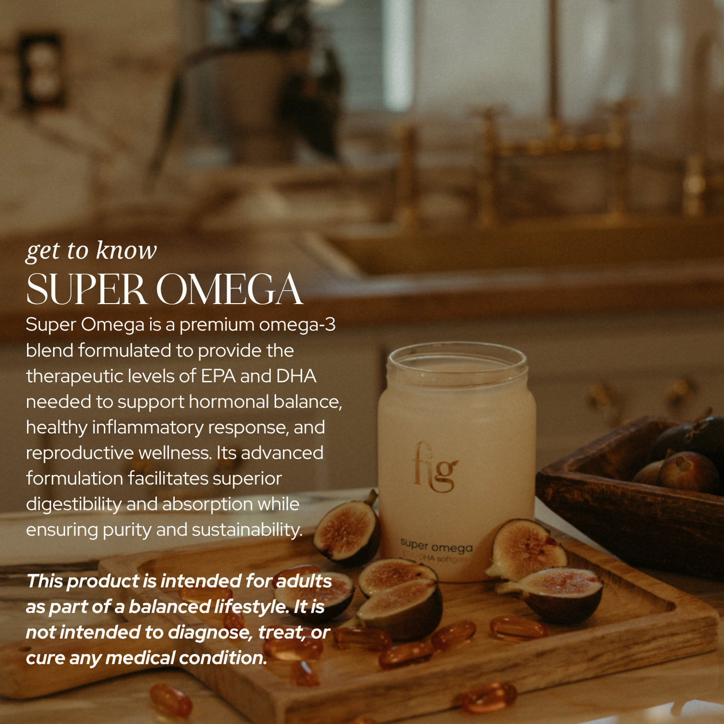 - 1 Super Omega jar: a beautiful frosted glass jar designed to fit 120 capsules perfectly for refilling your monthly supply.